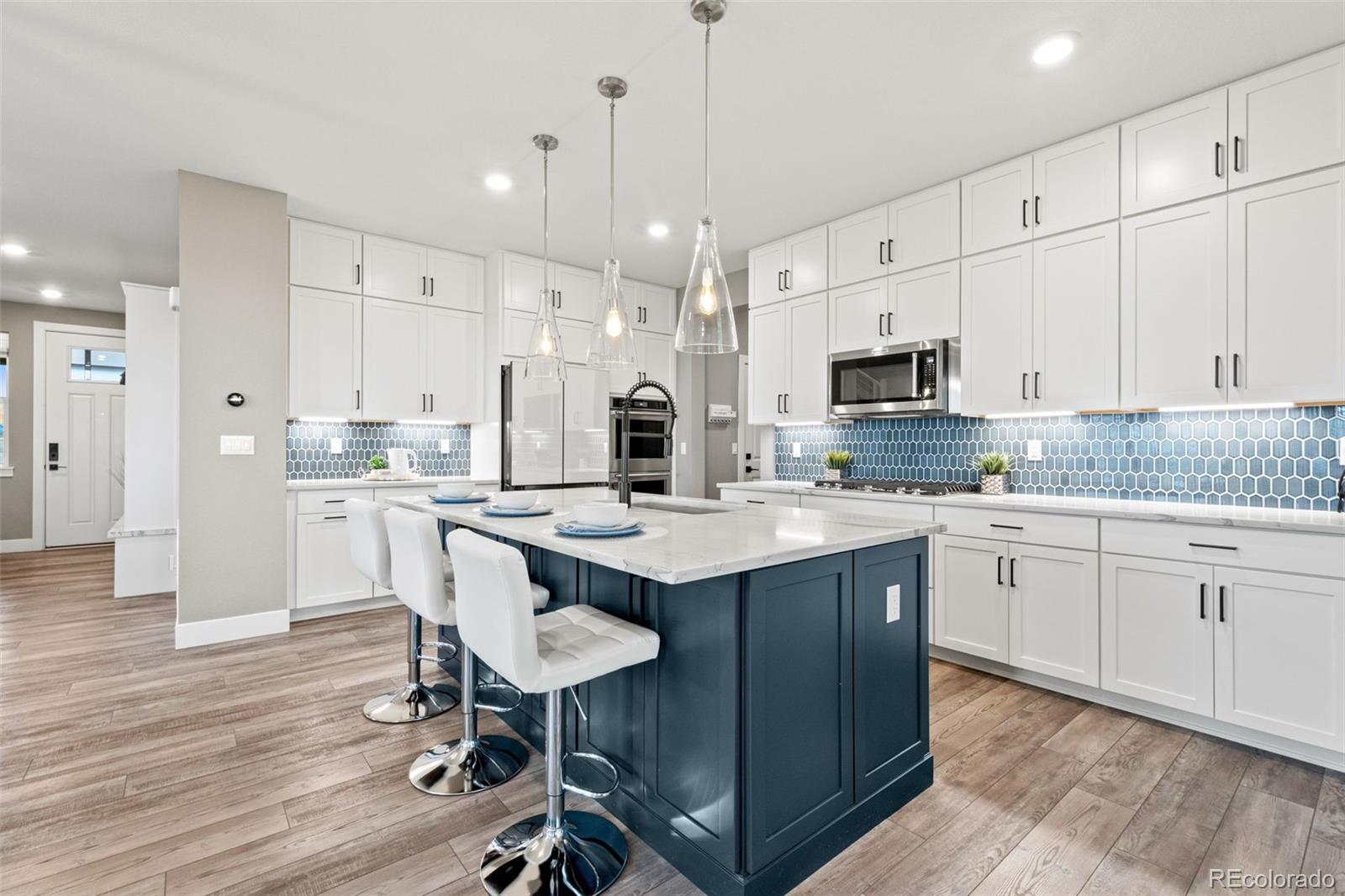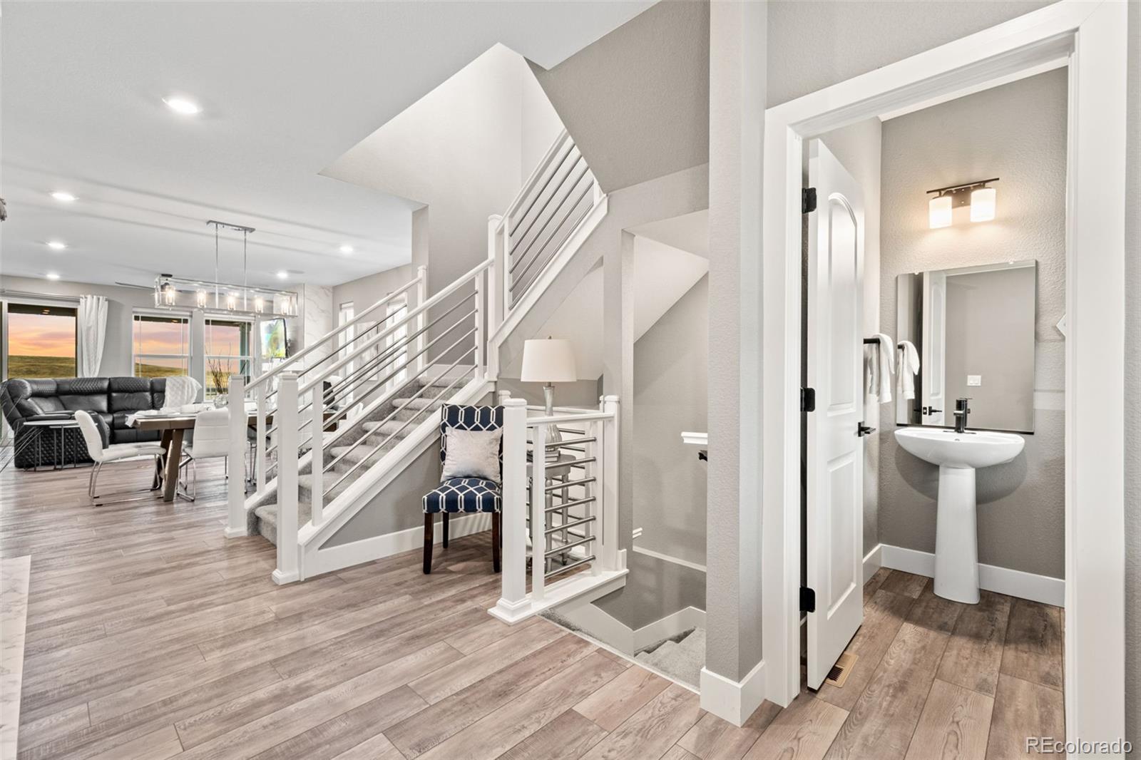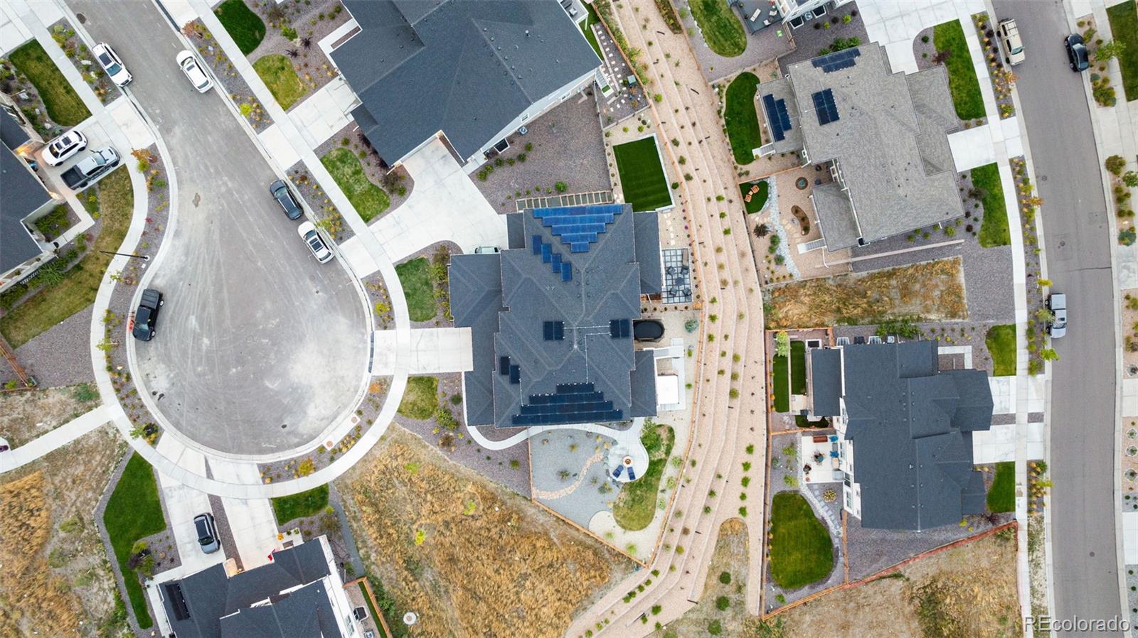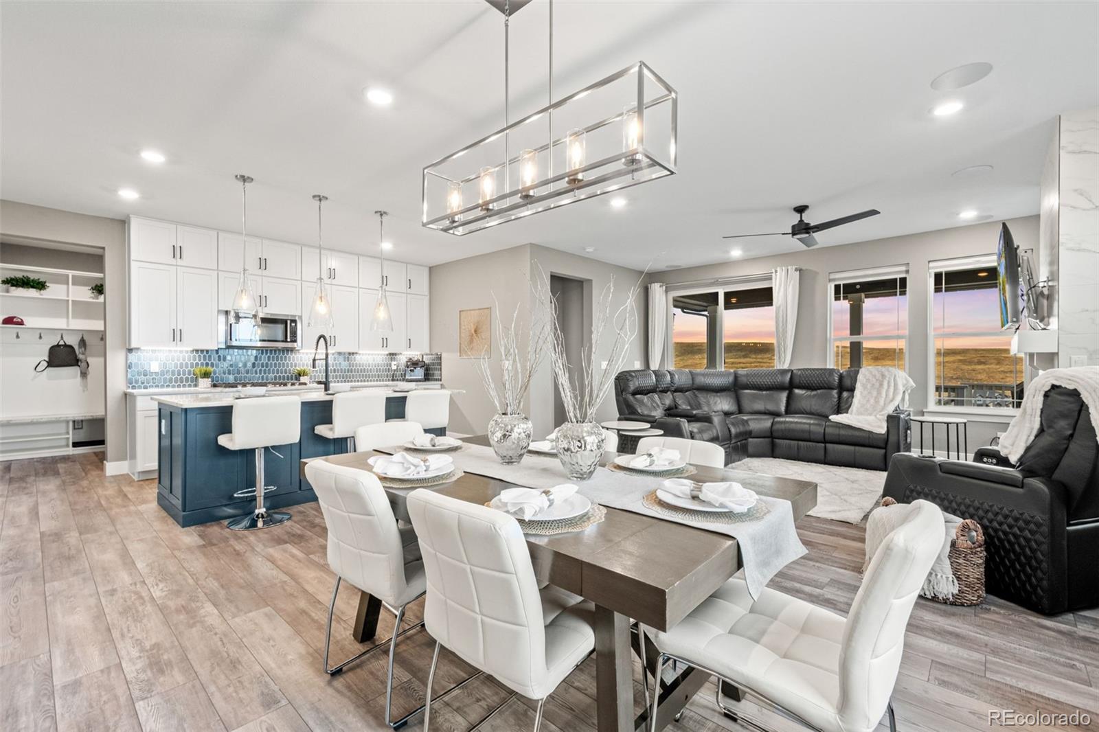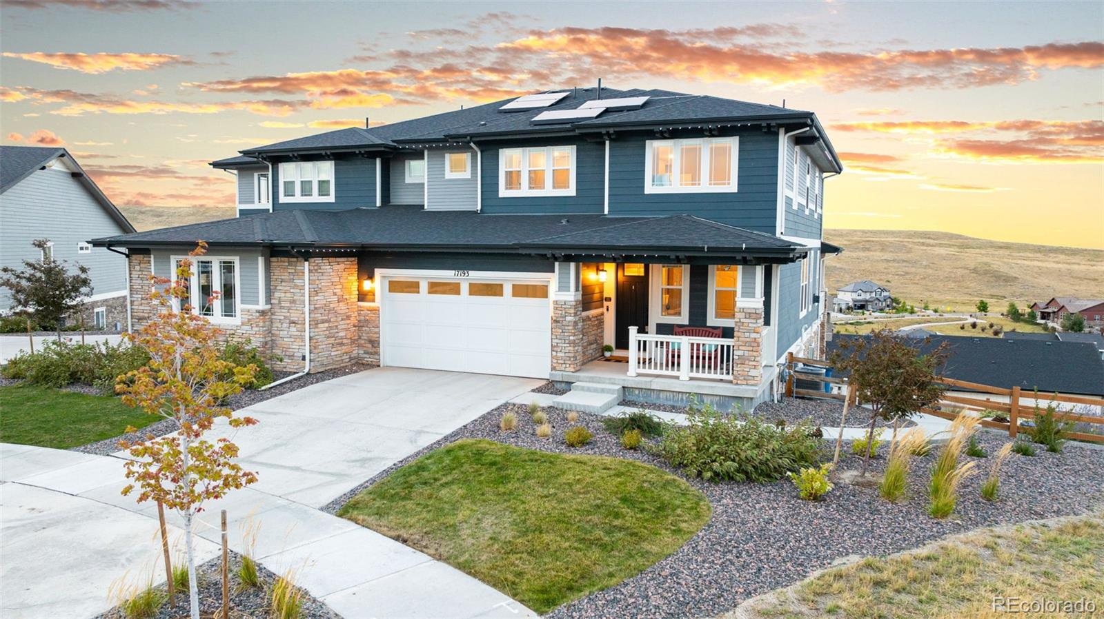 Every detail has been considered: built-in surround sound on main and lower levels, upgraded metal banisters, exterior Trimlights, dedicated EV charging, Cat6 wiring throughout, and a motorized storage lift in the garage. Enjoy SNOW REMOVAL and front yard maintenance by the HOA. Community has 2 Clubhouses/Fitness Centers, Pool, Parks, Trails, Tennis Court and onsite K8 school.