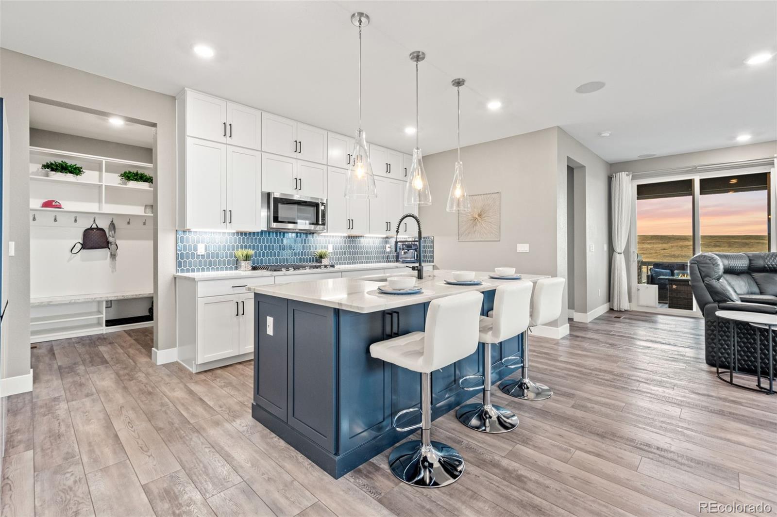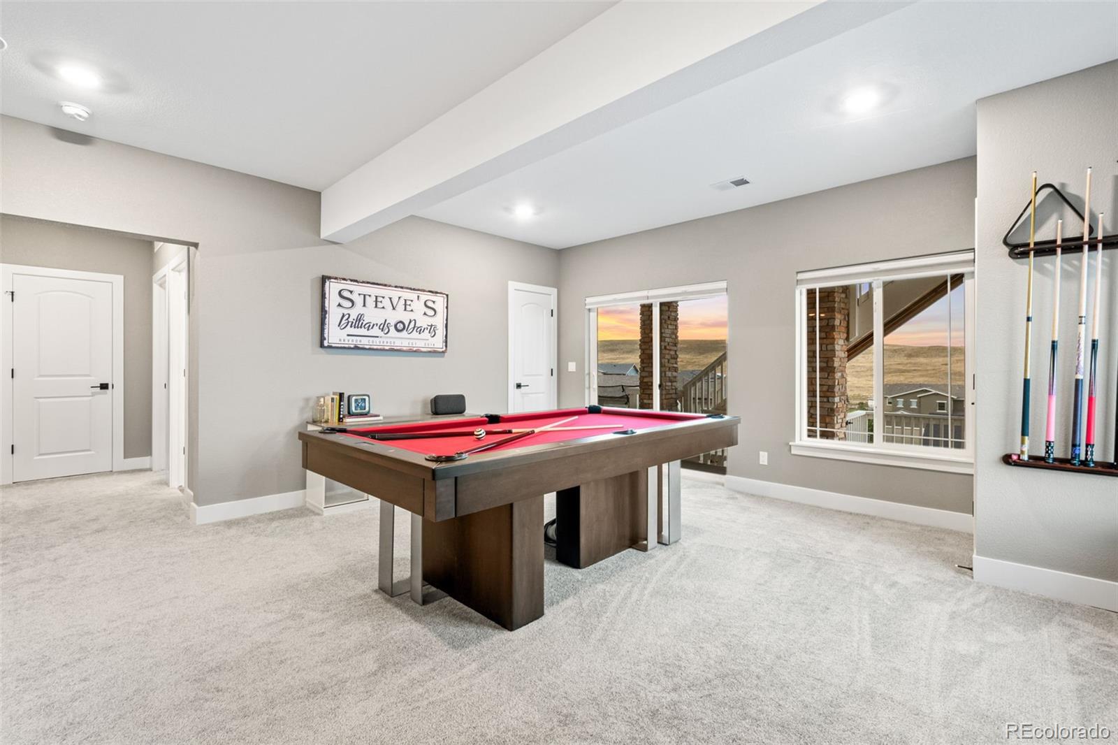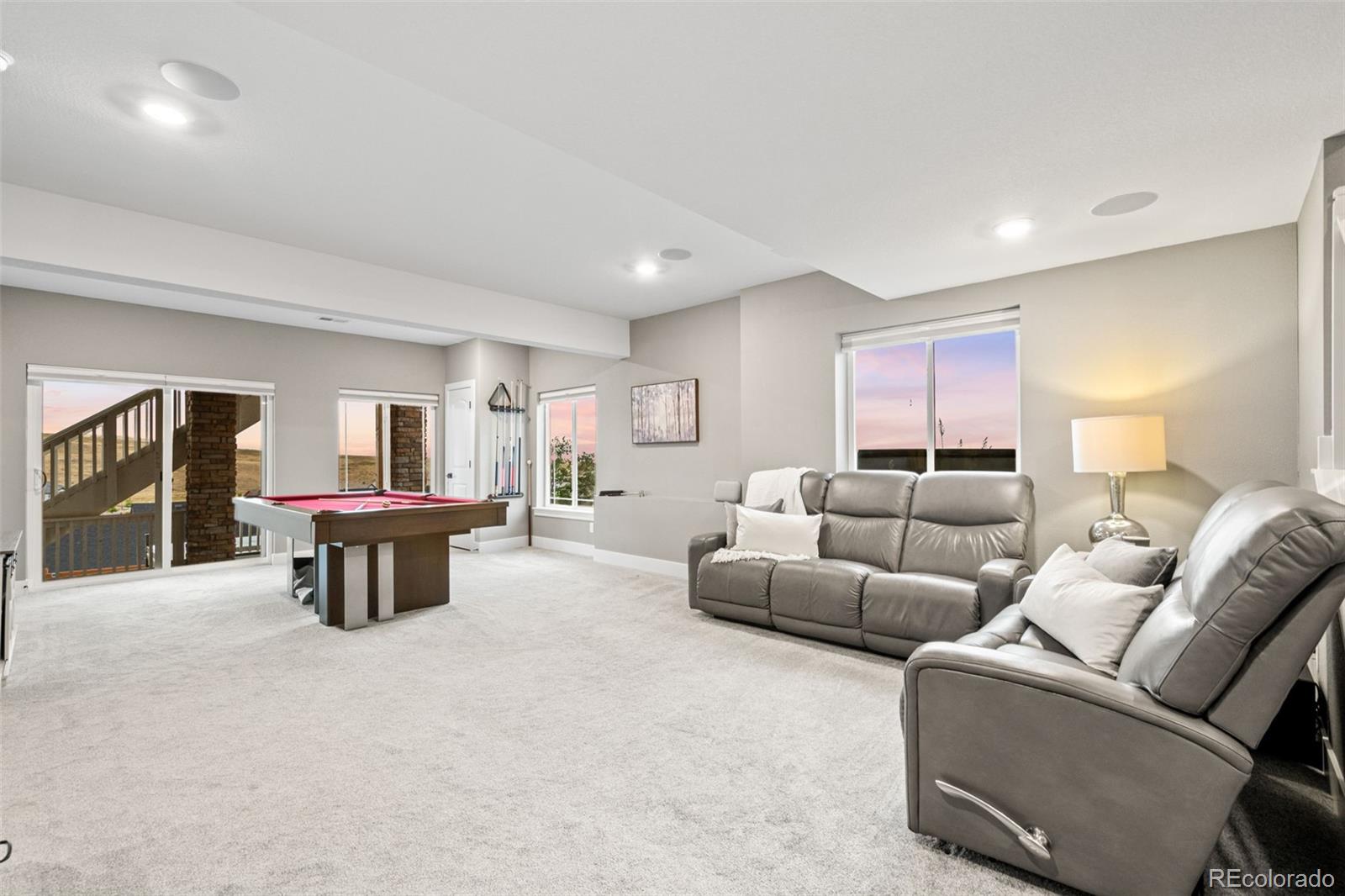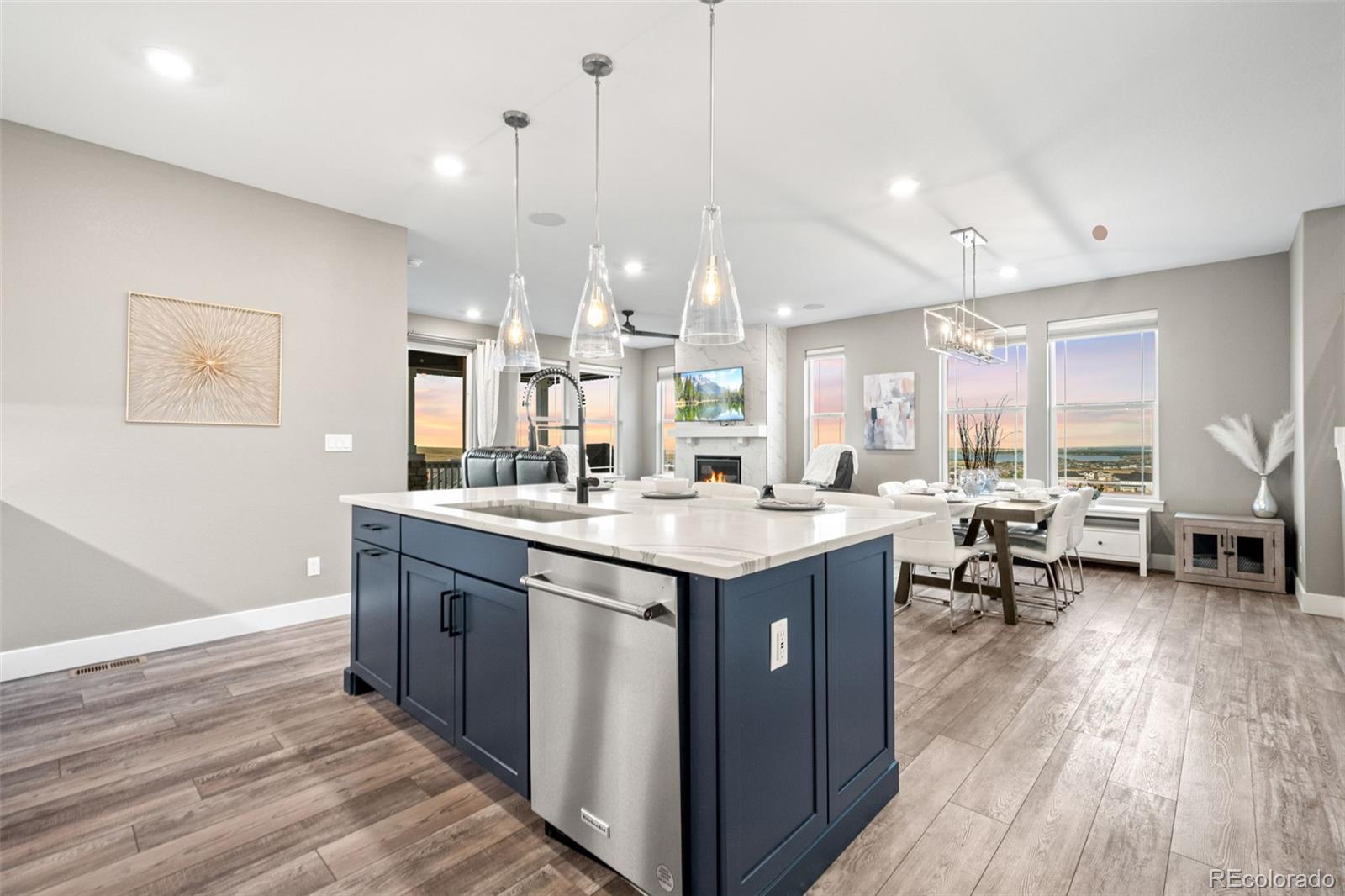Every detail has been considered: built-in surround sound on main and lower levels, upgraded metal banisters, exterior Trimlights, dedicated EV charging, Cat6 wiring throughout, and a motorized storage lift in the garage. Enjoy SNOW REMOVAL and front yard maintenance by the HOA. Community has 2 Clubhouses/Fitness Centers, Pool, Parks, Trails, Tennis Court and onsite K8 school.