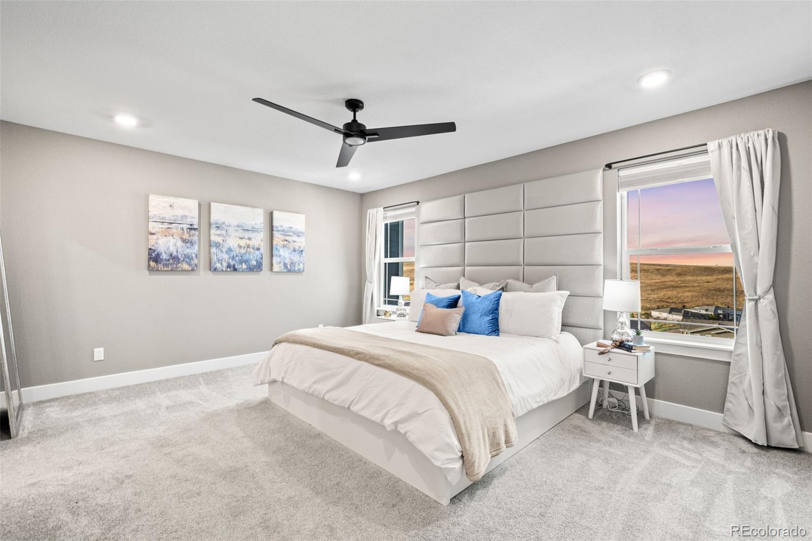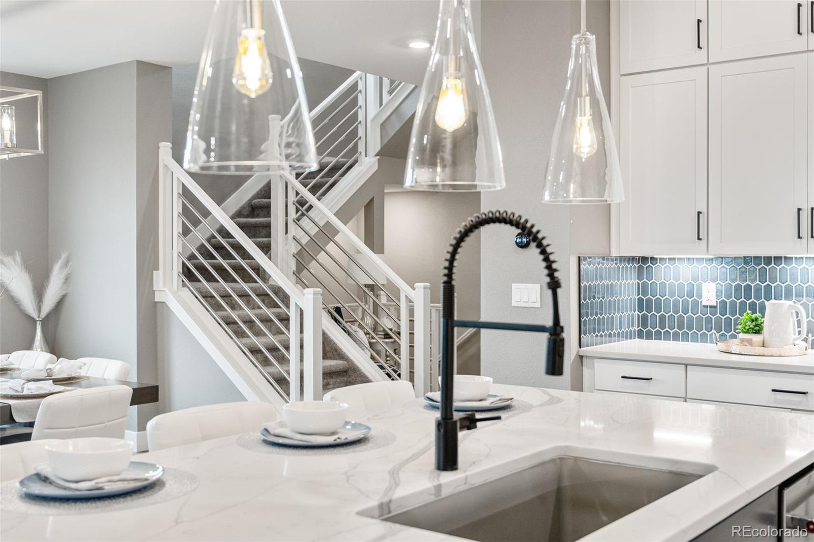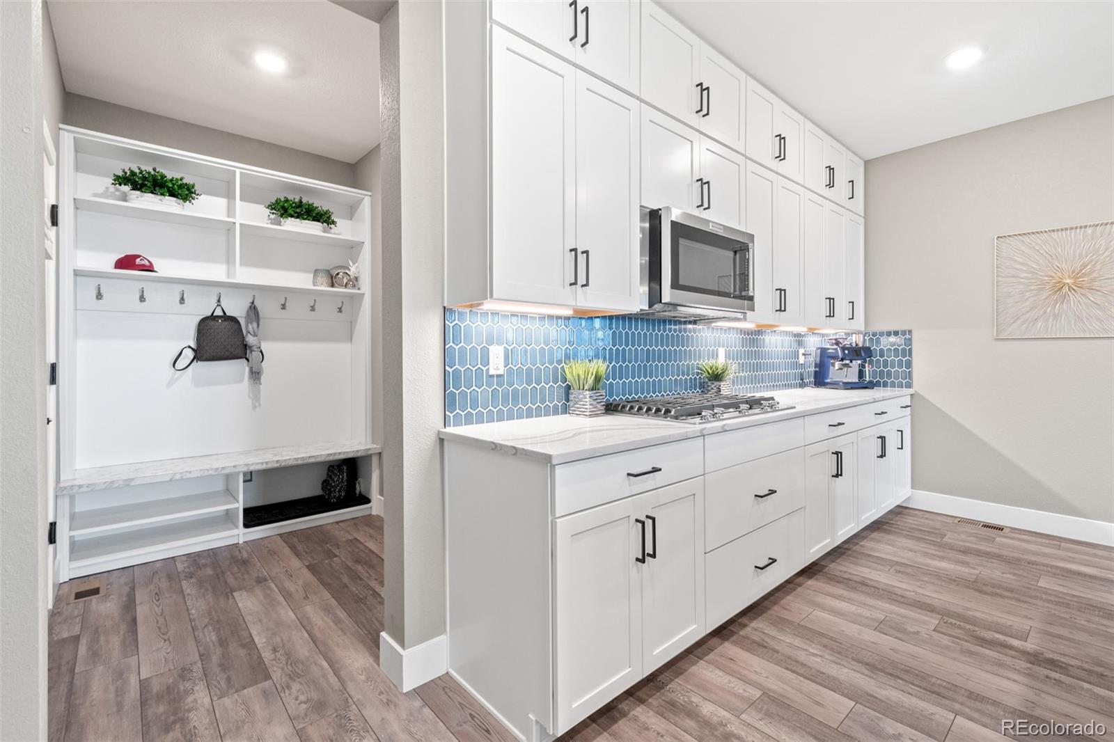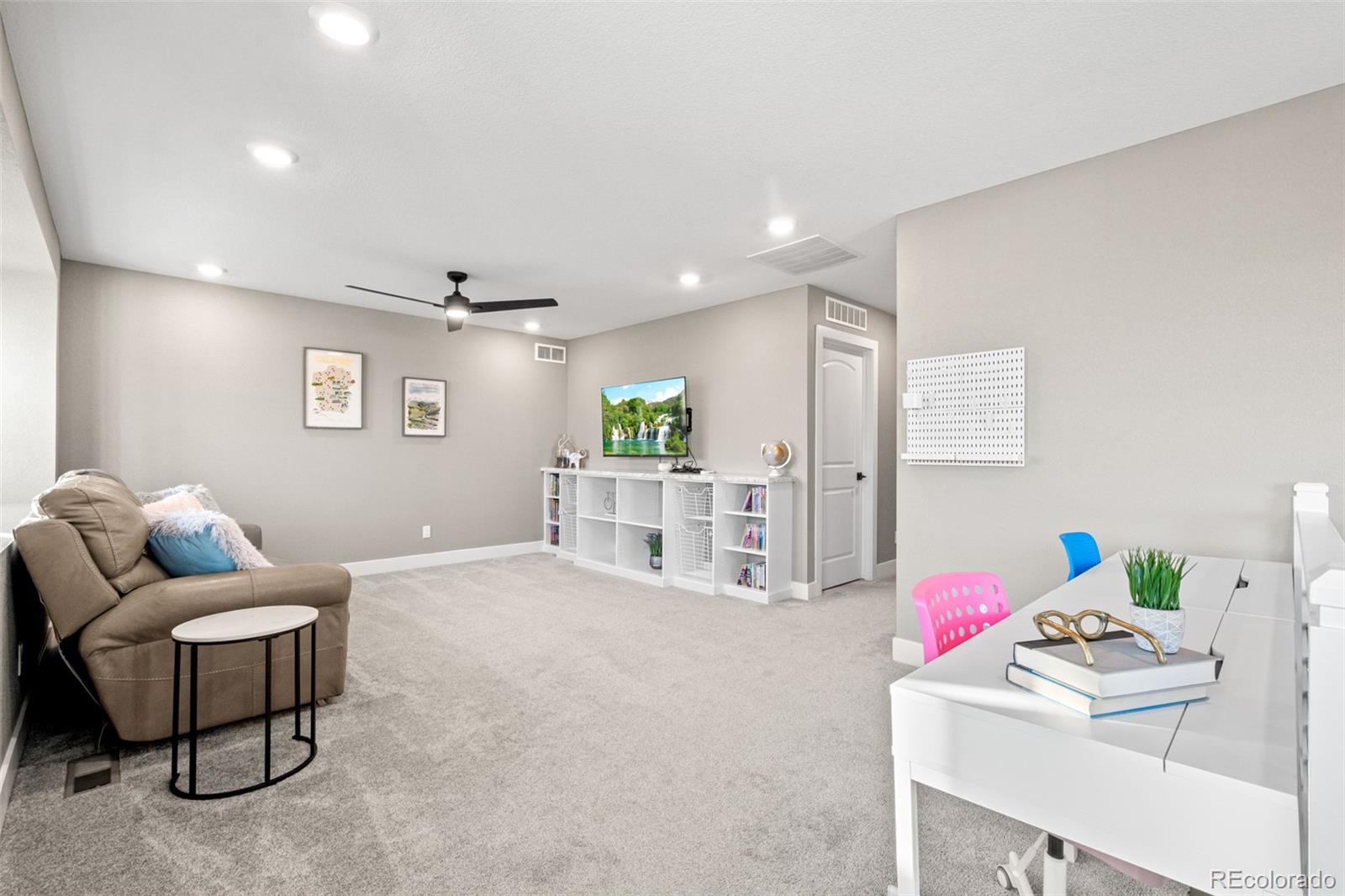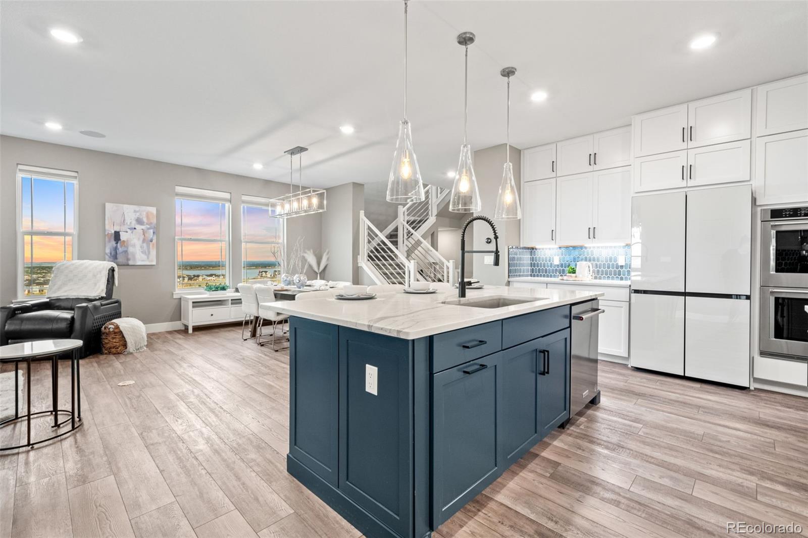 Every detail has been considered: built-in surround sound on main and lower levels, upgraded metal banisters, exterior Trimlights, dedicated EV charging, Cat6 wiring throughout, and a motorized storage lift in the garage. Enjoy SNOW REMOVAL and front yard maintenance by the HOA. Community has 2 Clubhouses/Fitness Centers, Pool, Parks, Trails, Tennis Court and onsite K8 school.